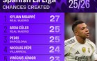 本賽季西甲創(chuàng)造機(jī)會(huì)最多榜:姆巴佩27次,居萊爾佩德里25次第二